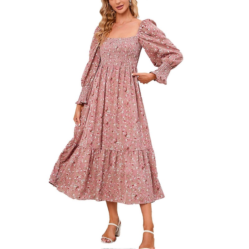 Item Type: DressFabric: 100% polyesterWashing method: Machine washCharacteristics: Square neck, floral print, shirred design,ruffle hem, casual fashion long sleeve dress.Matching: With a variety of hats, shoes and handbags, glasses, to create a fashionable look.Scenes: Suitable for office, dating, work, night out, birthday, daily, outdoor, shopping, home.Size: Approx. S: UK/AU: 6-8, US: 4-6, EURO: 36, Length: 126cm / 49.6in, Bust:69cm / 27.2in, Waist: 69cm / 27.2inM: UK/AU:10-12, US:8-10, EURO:38, Length: 128cm / 50.4in, Bust:74cm / 29.1in, Waist: 74cm / 29.1inL: UK/AU: 14-16, US: 12-14, EURO: 40, Length: 130cm / 51.2in, Bust: 79cm / 31.1in, Waist: 79cm / 31.1inXL: UK/AU: 18-20, US:16-18, EURO:42, Length: 132cm / 52in, Bust:85cm / 33.5in, Waist: 85cm / 33.5in