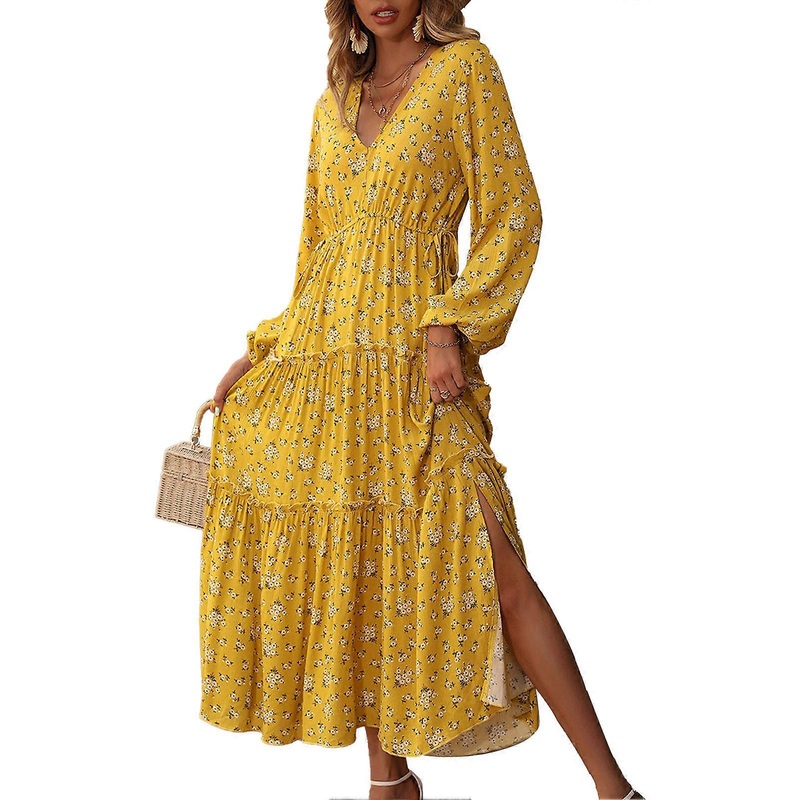 Item Type: Women Long DressMaterial: Polyester FiberFeatures: V Neck, Lantern Long Sleeves, Drawstring Waist at Both Sides, Flounce Stitching Hem, Floral Print Dress, Left Side SlitSituation: This super flowy dress is perfect for parties, everyday casual, holidays, clubs, dates, vacations, weddings, vacations, office work and everyday life.Matching: This dress is perfect to wear with short boots, high heels, loafers, etc. It can also be paired with a necklace and fine accessories.Garment Care: Machine Wash Cold, Do Not Use Bleach, Hang to DryProduct Size: S: Shoulder breadth: 38cm / 15in, Chest circumference: 93cm / 36.6in, Waist circumference: 99cm / 39in, Sleeve length: 59cm / 23.2in, Dress length: 130cm / 51.2in, Weight: 375g / 13.2ozM: Shoulder breadth: 39cm / 15.4in, Chest circumference: 97cm / 38.2in, Waist circumference: 103cm / 40.6in, Sleeve length: 60cm / 23.6in, Dress length: 132cm / 52in, Weight: 385g / 13.6ozL: Shoulder breadth: 41cm / 16.1in, Chest circumference: 103cm / 40.6in, Waist circumference: 109cm / 42.9in, Sleeve length: 61cm / 24in, Dress length: 134cm / 52.8in, Weight: 395g / 13.9ozXL: Shoulder breadth: 42cm / 16.5in, Chest circumference: 109cm / 42.9in, Waist circumference: 115cm / 45.3in, Sleeve length: 62cm / 24.4in, Dress length: 136cm / 53.5in, Weight: 405g / 14.3oz