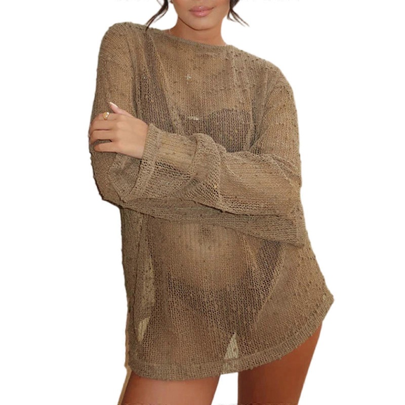 Women Long Sleeve Hollowed Out Crochet Pullover Beach Dress Sheer Mesh Sequined Loose Swimsuit Cover Up Shirt Sweater Brown M | Fruugo SG