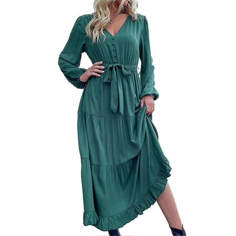 1Long Sleeves: Women long dress adopted long puff sleeves and V neck, simple and stylish, which can make you look more attractive. 2Waist Strap: Women dress adopted waist pleats and ruffles trim design, with straps, which can make your body proportions looks better. 3Easy Matching: Women long sleeve dress with A line hem and button front decor, which is perfect with ankle boots, high heels, casual shoes, etc. 4Wide Application: Women maxi dress is great for parties, leisure, holidays, clubs, dates, holidays, weddings, vacations, office work and daily life. 5Soft Viscose: Long sleeve maxi dress is made of viscose material, soft and skin friendly, with casual and fasion style, which is comfortable and breathable to wear.