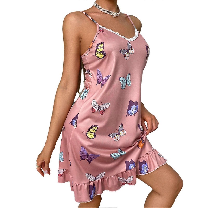 Item Type: Nighty DressMaterial: PolyesterCharacteristics: Spaghetti strap, lace trim, ruffle hem, backless, loose, nighty dressScenes: This home dress is perfect for daily leisure, holidays, weddings, vacations and daily life.Matching: This dress is perfect for the home, with slippers, casual shoes, etc.Washing guide: Cold water wash, wash by hand or machine, do not bleach, hanging to drySize: Approx. S: Front Length: 88cm /