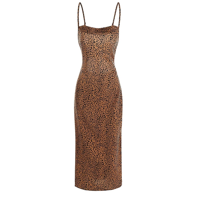Bohemian style, leopard dots printed, empire high waist, elastic waist, sexy side split, slim fit, midi long cami dress.