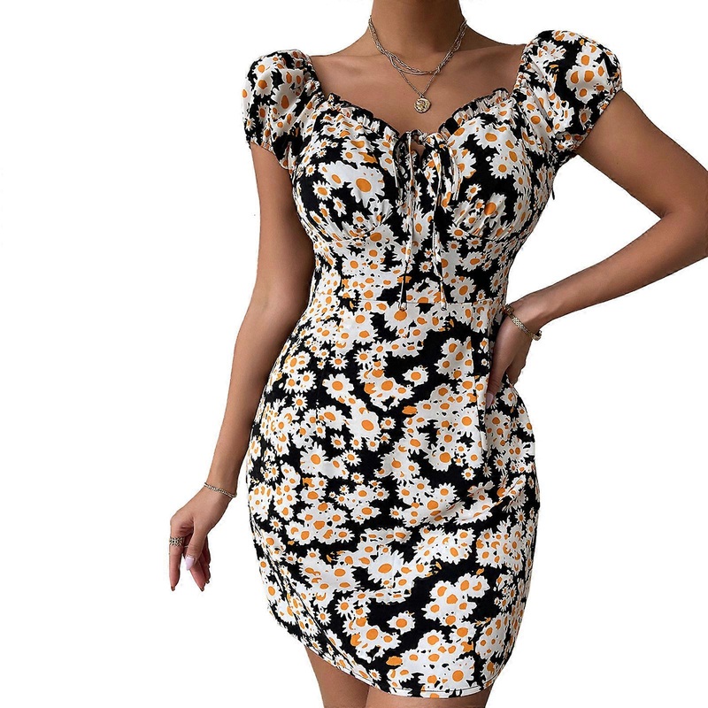 Women Puff Short Sleeve Sexy V-Neck Ruffles Trim Mini Slim Dress Daisy Floral Print Lace-Up Front High Waist Sundress S | Fruugo SG