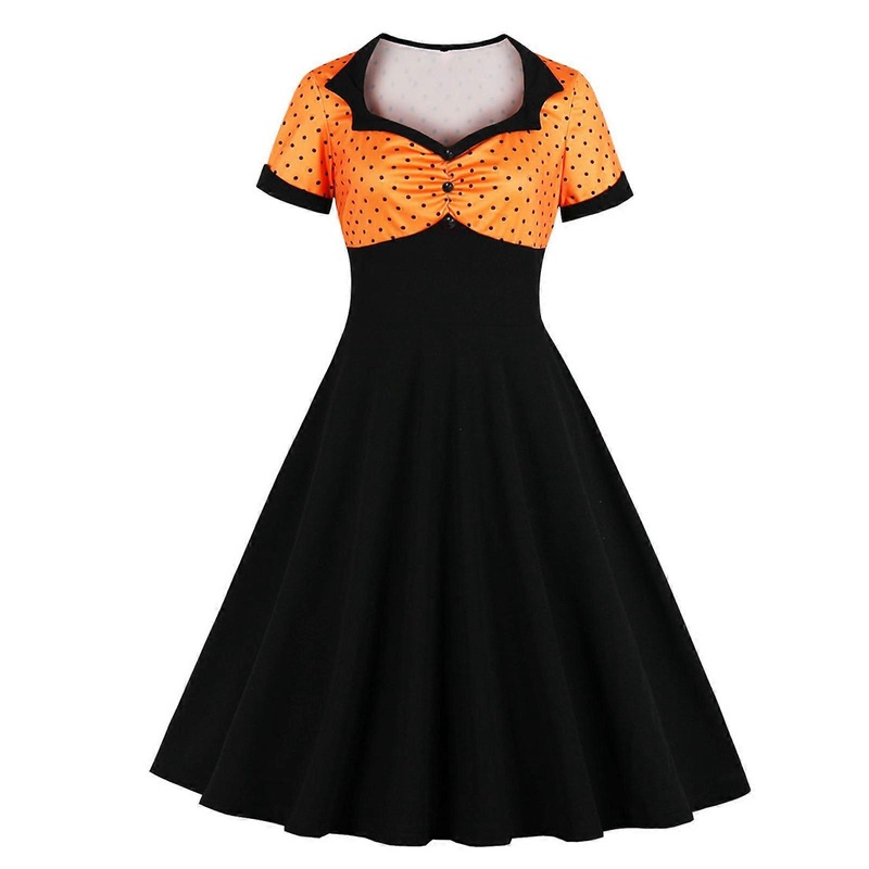 [“Description: \n\nFeatures:\nbrand new and high quality\nShort sleeves, square neckline, contrast color patchwork, with polka dot printed.\nFashionable imitation open-necked design on the neckline, buttons decoration.\nDecorative turn-down collar, empire high waist, pleated flared swing hem, concealed zipper closure at side.\n1950’s vintage style, matched a underskirt or petticoat would be perfect.\nMade of high quality cotton and spandex material, soft, skin-friendly, comfortable to wear.\nPerfect for 50’s theme party, daily casual, formal, dating, banquet, wedding, cocktail, evening wear, etc.\n1 dress only, other accessories demo in the picture are not included!\n\nSpecification:\nMaterial: Cotton+Spandex\nOptional Color: Tangerine, Yellow, Green, Black\nSize: S/for M/L/XL/2XL/3XL/4XL(Chinese Size,follow the size chart to select please)\nSize:S\tBust:88cm(34.64inch)\tWaist:68cm(26.77inch)\tShoulder:37cm(14.56inch)\tLength:102cm(40.15inch)\tSleeve:18cm(7.08inch)\nSize:M\tBust:93cm(36.61inch)\tWaist:73cm(28.74inch)\tShoulder:38.5cm(15.15inch)\tLength:103cm(40.55inch)\tSleeve:18.5cm(7.28inch)\nSize:L\tBust:98cm(38.58inch)\tWaist:78cm(30.71inch)\tShoulder:40cm(15.74inch)\tLength:104cm(40.94inch)\tSleeve:19cm(7.48inch)\nSize:XL\tBust:103cm(40.55inch)\tWaist:83cm(32.67inch)\tShoulder:41.5cm(16.33inch)\tLength:105cm(41.33inch)\tSleeve:19.5cm(7.67inch)\nSize:2XL\tBust:108cm(42.51inch)\tWaist:88cm(34.64inch)\tShoulder:43cm(16.92inch)\tLength:106cm(41.73inch)\tSleeve:20cm(7.87inch)\nSize:3XL\tBust:113cm(44.48inch)\tWaist:93cm(36.61inch)\tShoulder:44.5cm(17.51inch)\tLength:107cm(42.12inch)\tSleeve:20.5cm(8.07inch)\nSize:4XL\tBust:118cm(46.45inch)\tWaist:98cm(38.58inch)\tShoulder:46cm(18.11inch)\tLength:108cm(42.51inch)\tSleeve:21cm(8.26inch)\nQuantity: 1 pc \n\nWarm prompt:\n1.Asian people size is 1 or 2 sizes smaller than European and American.\n2.Please note that low temperature washed,do not bleach and place under the blazing for sun for quite a long for time.\n3.As different measuring methods,it will occur 1-3 for cm deviation about the items,please ensure that it is okay for you before ordering.\n4.Because of different monitors and lamplight,the picture may not reflect the actual color of the item,really thank you for your kind understanding!\n \nPackage includes:\u007F\n1 x Dress(without retail package)”]