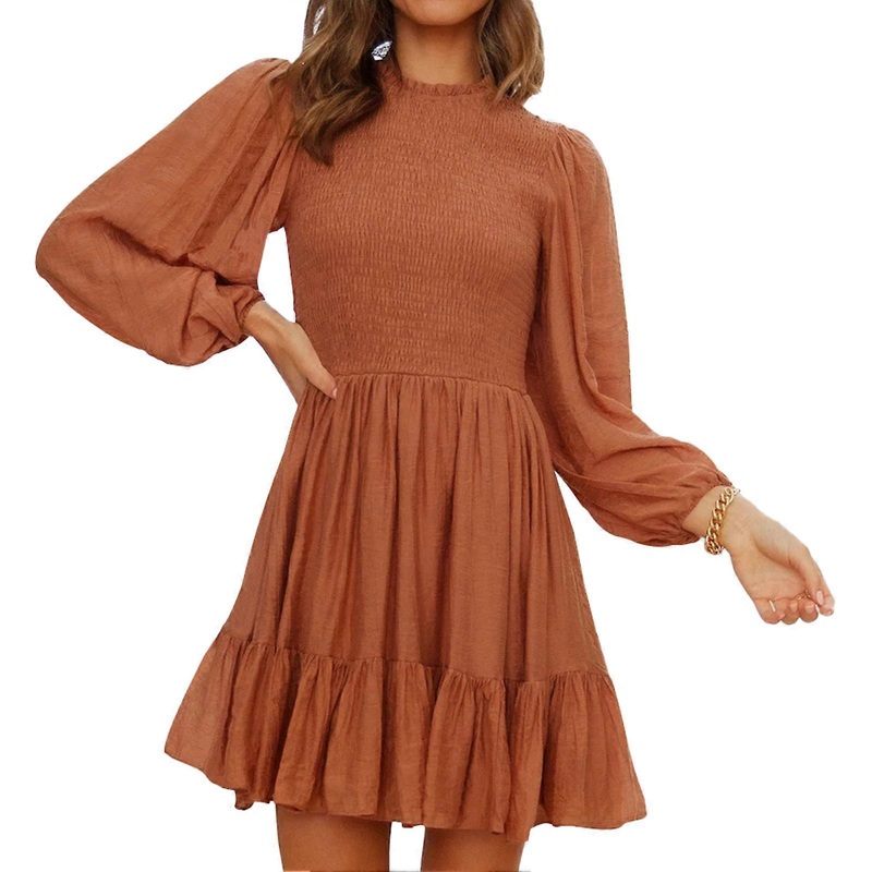 Item Type: Long Sleeve DressFabric: 100% PolyesterWashing Guidelines: Machine Wash, Do Not BleachStyle Features: Long sleeves, round neck, olive, elastic. High waist and loose hem.Applicable Scenes: Home leisure, daily life, work, shopping, office, school, business, family, vacation, holiday sleep, dating, beach, indoor and outdoor activities.Size: Length: S: 82.2cm / 32.4in, M: 84cm / 33.1in, L: 85.8cm / 33.8in, XL: 87.6cm / 34.5inBust: S: 79cm / 31.1in, M: 84cm / 33.1in, L: 89cm / 35in, XL: 96cm / 37.8inWaist: S: 66cm / 26in, M: 71cm / 28in, L: 76cm / 29.9in, XL: 84cm / 33.1inShoulder: S: 35.8cm / 14.1in, M: 37cm / 14.6in, L: 38.2cm / 15in, XL: 40.4cm / 15.9inSleeve: S: 52cm / 20.5in, M: 53cm / 20.9in, L: 54cm / 21.3in, XL: 55cm / 21.7in