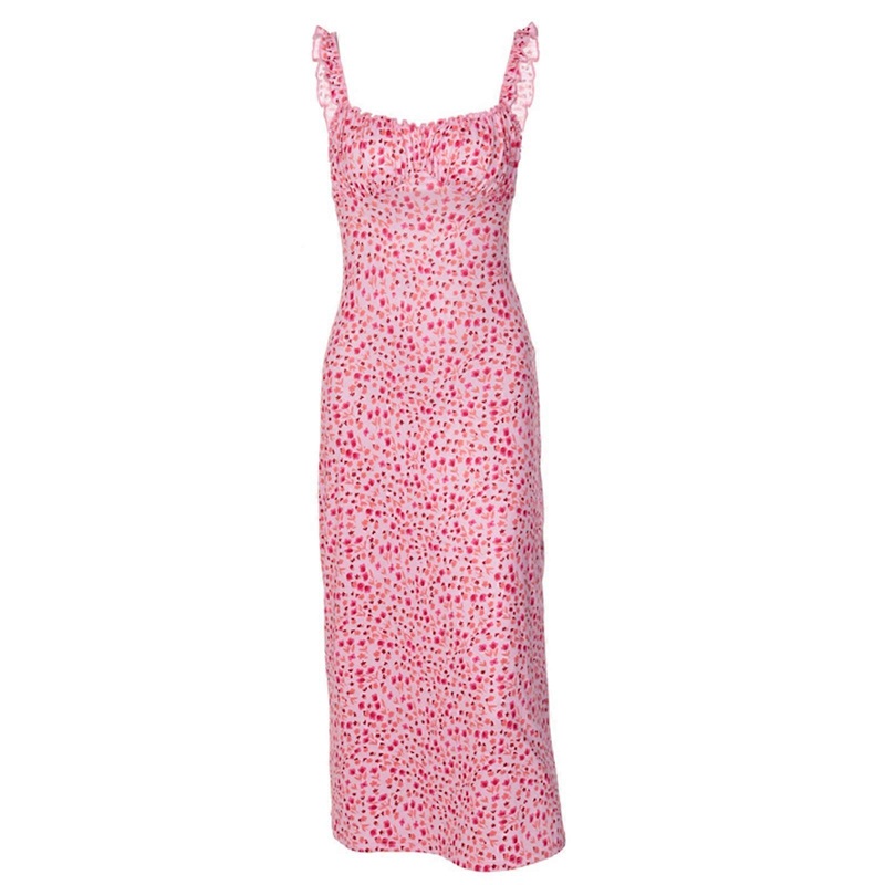 Description Features: brand new and high quality Sleeveless, elastic ruffles spaghetti shoulder straps, sexy low cut U neckline, midi long flowy dress. Bohemian style, vintage pink floral printed, ruched chest, empire high waist, package hip, slim fitting.