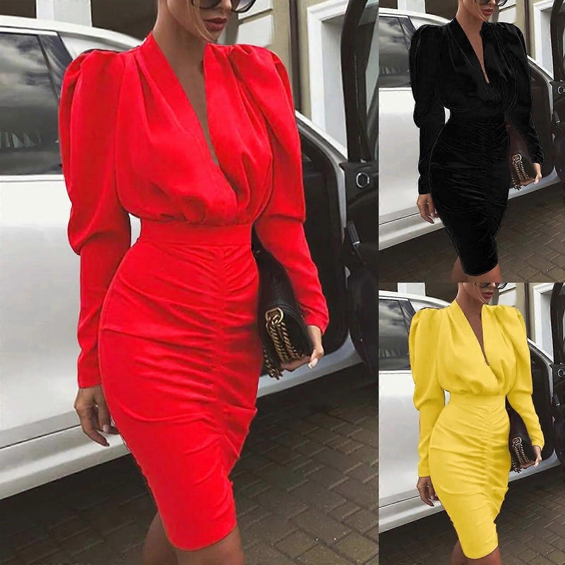 Description Women's Long Sleeve Autumn And Winter New Deep V Neck Bag Hip Sexy Dress Features: dress with boots, sandals or high heels for a retro,casual or vintage look. Suitable for various occasions. This midi dress can be worn over as an alternative to