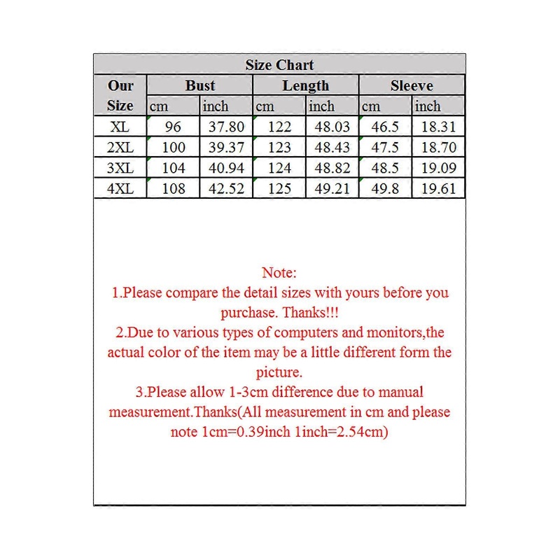 Size:4XL Bust:122cm(48.03inch) Waist:106cm(41.73inch) Hip:124cm(48.81inch) Length:127cm(50.00inch) Sleeve:50cm(19.68inch)