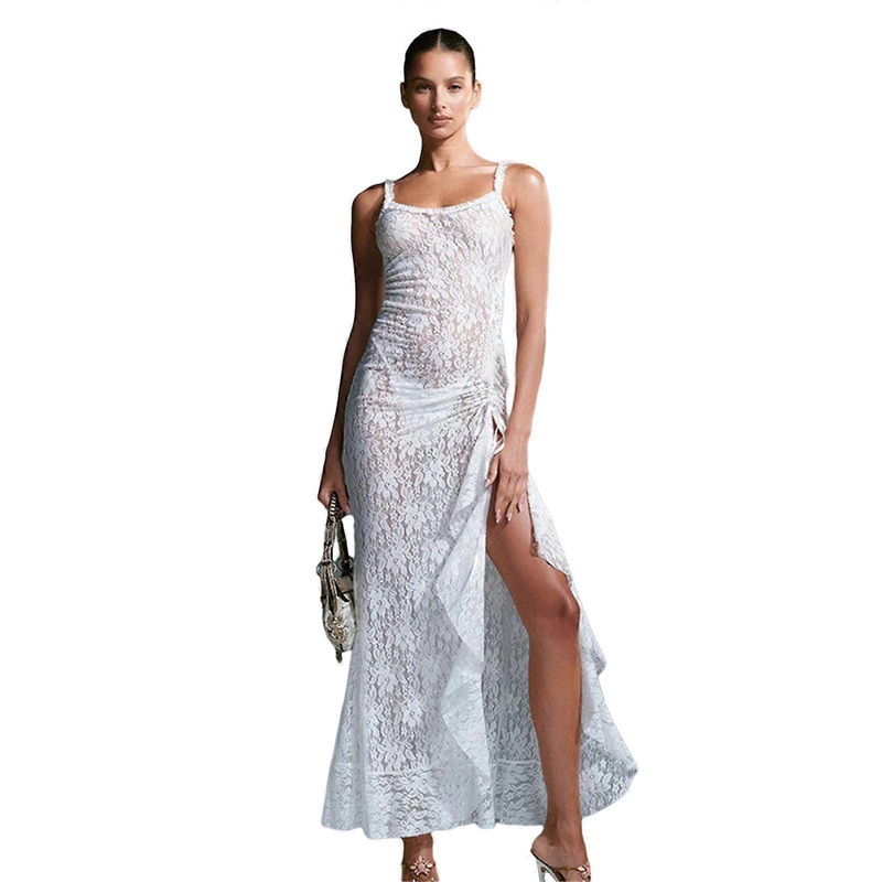 Sexy see through flower lace, solid, thin shoulder straps, pacakge hip long dress.
