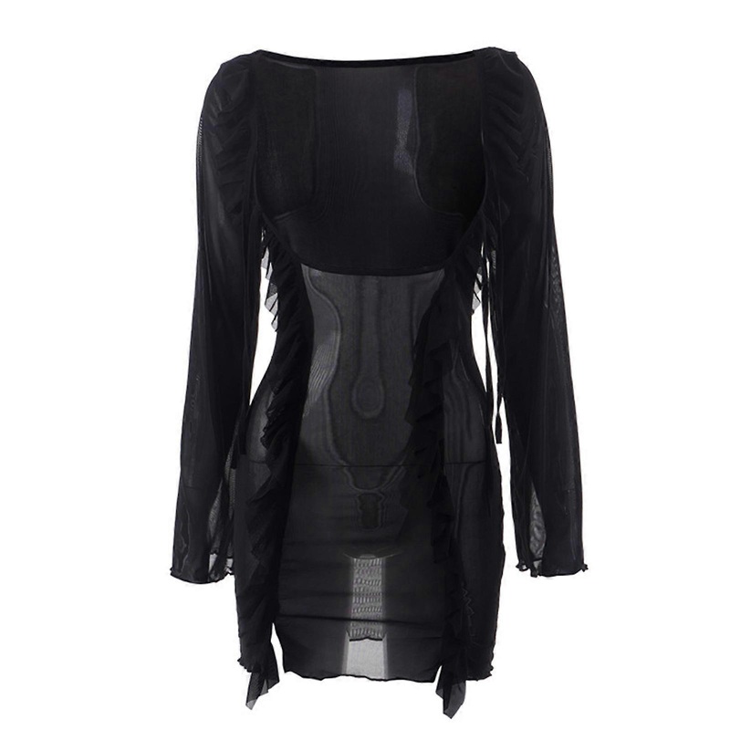 Solid color, sexy see-through mesh, ruffle tassel trim patchwork, bodycon dress.