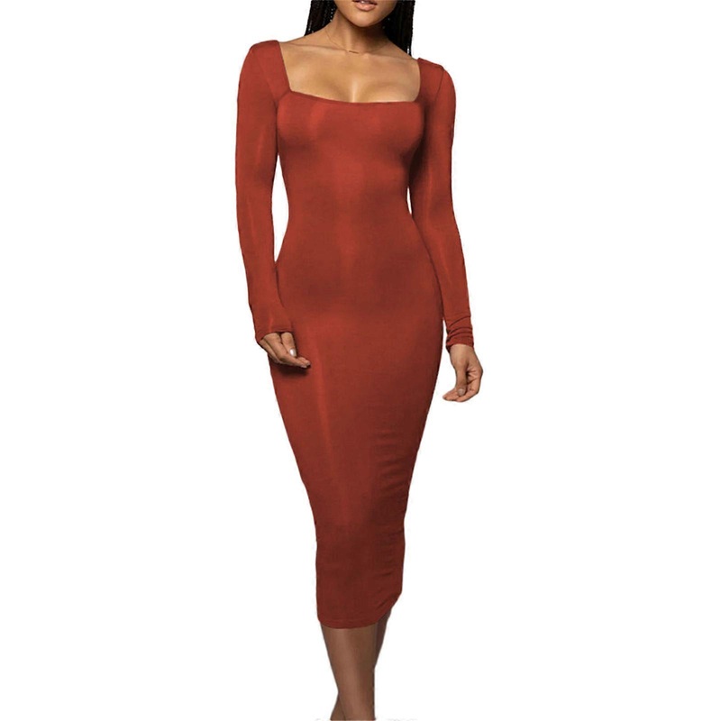 Slim and tight, the dress length to calf shows your body. Square neck styles can better show your elegant collarbone.