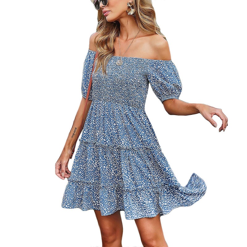 Women Short Puff Sleeve Sexy Off Shoulder Mini Swing Dress Boho Floral Print Shirred High Waist A-Line Ruffles Sundress S | Fruugo SG