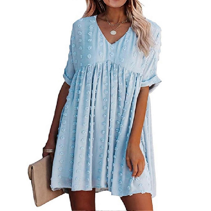 Description Item Type: Women Swiss Dot Short DressMaterial: 100% PolyesterCleaning: Hand wash or machine wash, hanging to dry, do not bleach.Style Characteristics: Women V neck dress is stylish and elegant. Lovely swiss dot design,short sleeve, flowing hem