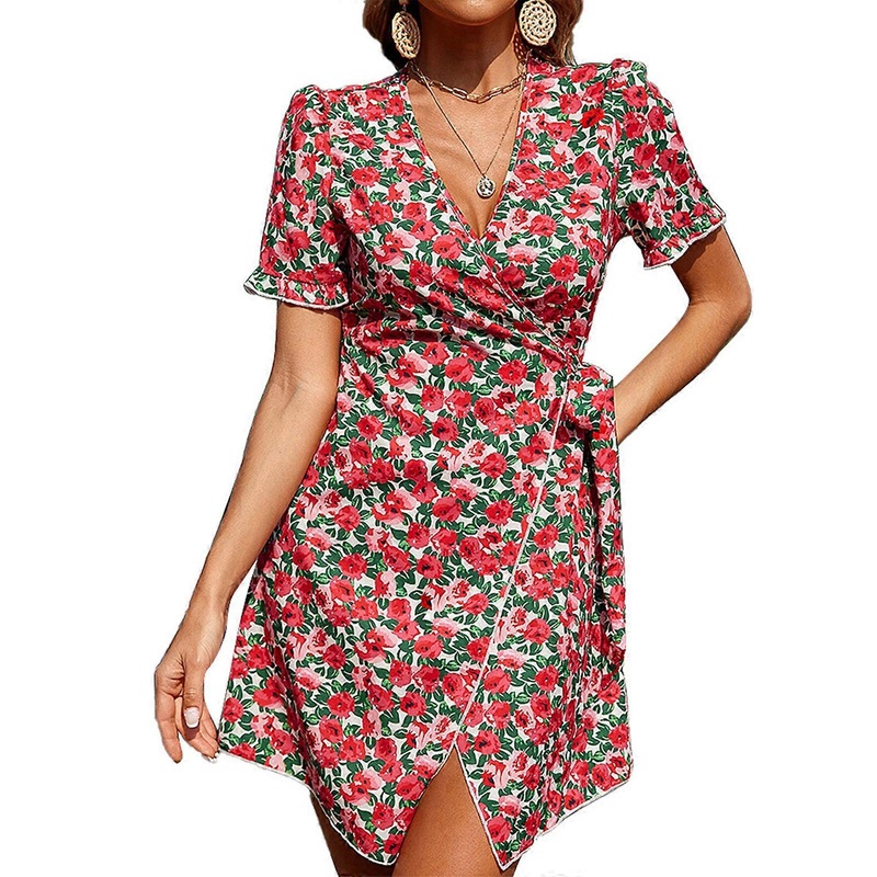 [“Description: \n\nFeatures:\nbrand new and high quality\nShort sleeves, ruffles elastic cuffs, sexy deep v neckline, empire high waist, above knee mini length.\nBohemian style, vintage floral printing, for cross wrap, split front, irregular hem, A-line style, tie belt at waist.\nMade of high quality polyester, lightweight, skin-friendly, breathable, soft and comfortable to wear.\nThe waist dress shows the body curve very well, irregular skirt design makes the legs look more slender.\nYou can wear them with ankle boots, high heels and sandals, or you can accessorize them with whatever you want.\nPerfect for summer and autumn daily wear. Great for daily casual, party, beach, vacation, wedding, and other occasions.\n1 dress only, other accessories demo in the picture are not included!\n\nSpecification:\nMaterial: Polyester\nOptional Color: Red, Violet\nSize: S/for M/L(Chinese Size,follow the size chart to select please)\nSize:S\tBust:91cm(35.82inch)\tWaist:83cm(32.67inch)\tShoulder:36cm(14.17inch)\tLength:87cm(34.25inch)\nSize:M\tBust:95cm(37.40inch)\tWaist:87cm(34.25inch)\tShoulder:37cm(14.56inch)\tLength:89cm(35.03inch)\nSize:L\tBust:101cm(39.76inch)\tWaist:93cm(36.61inch)\tShoulder:38.5cm(15.15inch)\tLength:91cm(35.82inch)\nQuantity: 1 pc \n\nWarm prompt:\n1.Asian people size is 1 or 2 sizes smaller than European and American.\n2.Please note that low temperature washed,do not bleach and place under the blazing for sun for quite a long for time.\n3.As different measuring methods,it will occur 1-3 for cm deviation about the items,please ensure that it is okay for you before ordering.\n4.Because of different monitors and lamplight,the picture may not reflect the actual color of the item,really thank you for your kind understanding!\n \nPackage includes:\u007F\n1 x Dress(without retail package)”]
