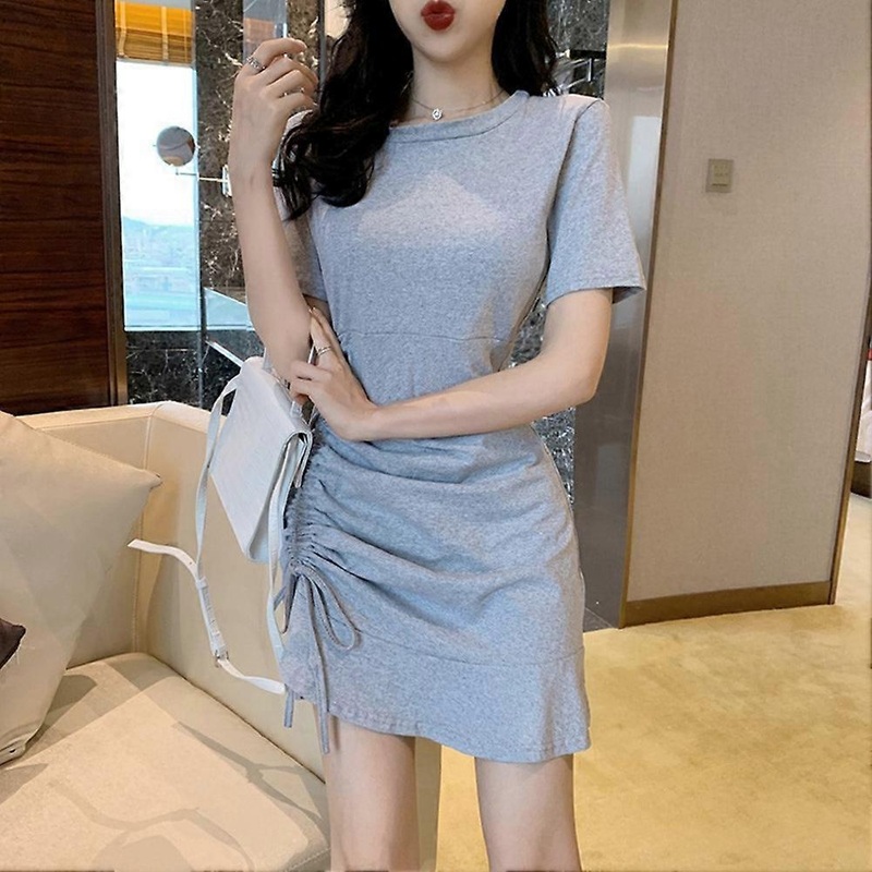 Women Solid Color Ruffle Dress Strap Drawstring Short Sleeve Round Neck Dress (Gray 2XL) | Fruugo SG