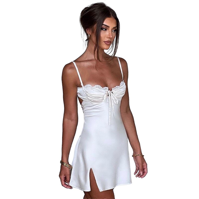 Description Features: Brand new and high quality Spaghettis straps, lace trim and ruched chest, tie front, backless with tie, split bottom, solid color, bodycon, sexy mini dress. Crafted from polyester, this dress offer comfort and breathability, ensuring