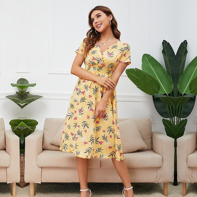 Style: Casual Pattern Type: print Sleeve Length:short sleeve Gender: Women Dresses Length: mid-Calf Weight: 250 g Material: polyester 100% Neckline: v neck Silhouette: A-line Decoration: none Waistline: empire Sleeve Style: regular sleeve Season: spring,summer Product Include: 1*Dress Label: Yes Size: S, Bust: 92 cm, Length: 105 cm, Waist: 92 cm, Hips: 96 cm, Sleeve: 17 cm, Shoulder: 37 cm Size: M, Bust: 98 cm, Length: 106 cm, Waist: 98 cm, Hips: 100 cm, Sleeve: 18 cm, Shoulder: 38 cm Size: L, Bust: 102 cm, Length: 107 cm, Waist: 102 cm, Hips: 106 cm, Sleeve: 19 cm, Shoulder: 39 cm Size: XL, Bust: 108 cm, Length: 108 cm, Waist: 108 cm, Hips: 112 cm, Sleeve: 20 cm, Shoulder: 40 cm Size: XXL, Bust: 112 cm, Length: 109 cm, Waist: 112 cm, Hips: 116 cm, Sleeve: 21 cm, Shoulder: 41 cm