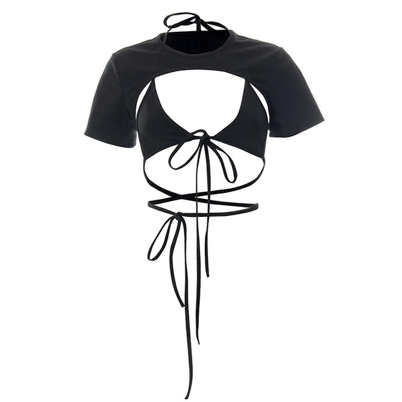 Description ["brand new and high quality\n\nFeatures:\n\n1pc short sleeve cropped t-shirt and 1 pc halter bandage bralette.\nBralette: self-tie halter collar, v neckline, for triangle cup, lace-up bandage design.\nT-shirt cover ups: short sleeve, round nec