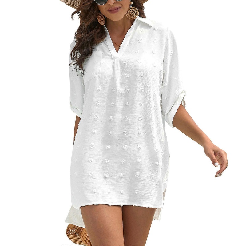 [“brand new and high quality\n\nFeatures:\nMade of high quality polyester, lightweight, soft and comfortable to wear and protects you skin.\nTurn-down collar, sexy v neckline, 3/4 sleeves, casual pull-on closure, loose fitting, simple solid color.\nfor Swiss polka dot decoration, high low hem, side split on asymmetrical hem cover your hip perfectly.\nThis 3/4 sleeve swimsuit cover up can be used as a casual shirt, tunic shirt dress, or a shirt cover up. \nYou could easily wear this as a dress at a beach cafe or poolside. It is suitable for matching with bikini sets or any summer shorts.\n1 shirt only, other accessories demo in the picture are not included!\n\nSpecification:\nMaterial: Polyester\nOptional Color: White, Black, Pink, for Sky Blue\nSize: S/for M/L/XL(Chinese Size,follow the size chart to select please)\nSize:S\tBust:110cm(43.31inch)\tSleeve:40cm(15.74inch)\tFront Length:80cm(31.49inch)\tBack Length:84cm(33.07inch)\nSize:M\tBust:115cm(45.27inch)\tSleeve:41cm(16.14inch)\tFront Length:82cm(32.28inch)\tBack Length:86cm(33.85inch)\nSize:L\tBust:120cm(47.24inch)\tSleeve:42cm(16.53inch)\tFront Length:84cm(33.07inch)\tBack Length:88cm(34.64inch)\nSize:XL\tBust:125cm(49.21inch)\tSleeve:43cm(16.92inch)\tFront Length:86cm(33.85inch)\tBack Length:90cm(35.43inch)\nQuantity: 1 pc \n\nWarm prompt:\n1.Asian people size is 1 or 2 sizes smaller than European and American.\n2.Please note that low temperature washed,do not bleach and place under the blazing for sun for quite a long for time.\n3.As different measuring methods,it will occur 1-3 for cm deviation about the items,please ensure that it is okay for you before ordering.\n4.Because of different monitors and lamplight,the picture may not reflect the actual color of the item,really thank you for your kind understanding!\n \nPackage includes:\u007F\n1 x Shirt(without retail package)”]