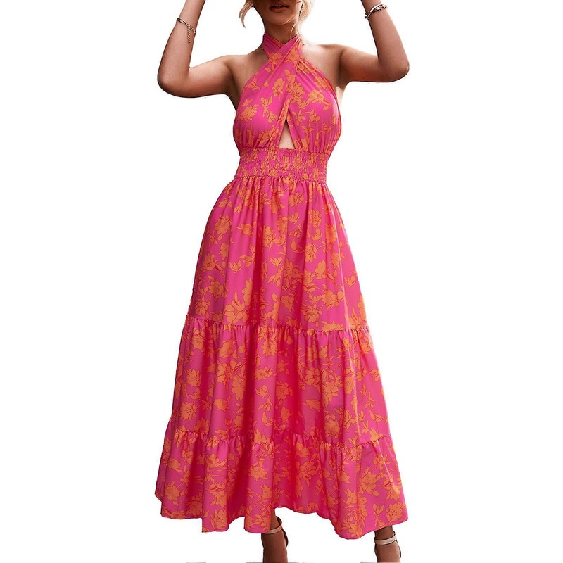 Item Type: Women Maxi DressMaterial: 95% Polyester Fiber, 5% PolyurethaneCleaning: Machine wash, do not bleachStyle Characteristics: Ladies casual printed dress, crossover halter neck design, backless, stylish and lovely. Simple, random maxi length printed dress is made of 95% polyester fiber and 5% polyurethane, soft and elastic, making it light and perfect for summer weather. Scene: Perfect for summer, wear this outfit for casual evenings such as drinks with friends, hair styling and makeup, graduation parties and beach walks. They are very comfortable and can be worn at home and are suitable for office work. You can easily match it with any jewelry, sandals, high heels, flip flops or even sneakers. Size:S: Back Length: 98cm / 38.58in, Waist: 60cm / 23.62in, Weight: 305g / 10.76oz.M: Back Length: 99cm / 38.98in, Waist: 64cm / 25.20in, Weight: 315g / 11.11oz.L: Back Length: 100cm / 39.37in, Waist: 68cm / 26.77in, Weight: 325g / 11.46oz.XL: Back Length: 101cm / 39.76in, Waist: 72cm / 28.35in, Weight: 335g / 11.82oz.