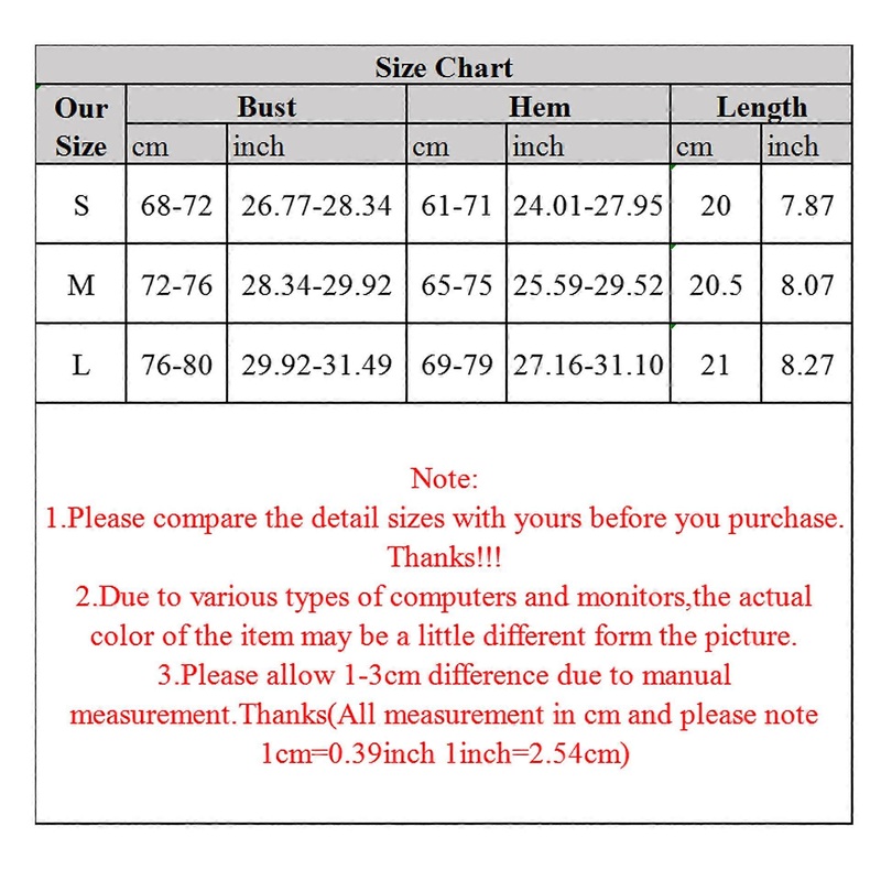 [“Description: \n\nFeatures:\nbrand new and high quality\nSleeveless, for rhinestone chain shoulder strap, double strappy, sexy deep V-neck.\nBack zipper closure, sexy backless, slim fitting, wrapped chest, short cropped length.\nMade of high quality polyester, stretchy, skin-friendly, soft and comfortable to wear.\nIt can highlight your collarbone and make your figure look slimmer and slender.\nWearing it outside the blouse, dress, t-shirt and so on, which can highlight your curve.\nSuitable for parties, dating, night club, bar, stage performance, casual daily wear, etc.\n1 camisole only, other accessories demo in the picture are not included!\n\nSpecification:\nMaterial: Polyester\nColor: Black\nSize: S/for M/L(Chinese Size,follow the size chart to select please)\nSize:S\tBust:68cm-72cm(26.77inch-28.34inch)\tHem:61cm-71cm(24.01inch-27.95inch)\tLength:20cm(7.87inch)\nSize:M\tBust:72cm-76cm(28.34inch-29.92inch)\tHem:65cm-75cm(25.59inch-29.52inch)\tLength:20.5cm(8.07inch)\nSize:L\tBust:76cm-80cm(29.92inch-31.49inch)\tHem:69cm-79cm(27.16inch-31.10inch)\tLength:21cm(8.26inch)\nQuantity: 1 pc \n\nWarm prompt:\n1.Asian people size is 1 or 2 sizes smaller than European and American.\n2.Please note that low temperature washed,do not bleach and place under the blazing for sun for quite a long for time.\n3.As different measuring methods,it will occur 1-3 for cm deviation about the items,please ensure that it is okay for you before ordering.\n4.Because of different monitors and lamplight,the picture may not reflect the actual color of the item,really thank you for your kind understanding!\n \nPackage includes:\n1 x Camisole(without retail package)”]