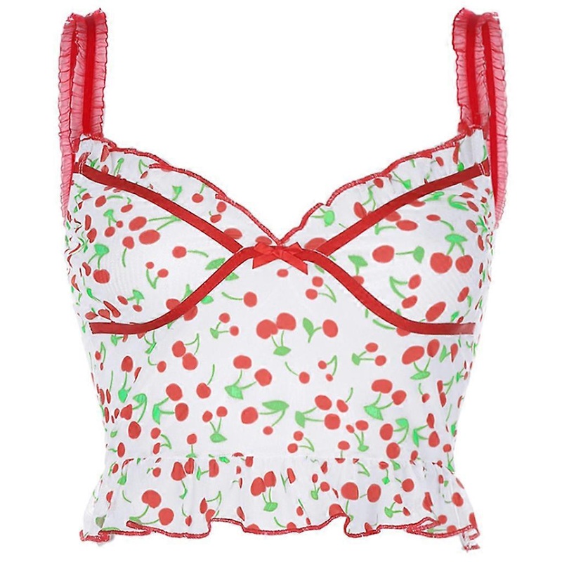 Description ["Description: \n\nFeatures:\nbrand new and high quality\nSleeveless, ruffles spaghetti straps, sexy V neckline and backless, ruffles trim, slim fit, short cropped length.\nfor Cross striped, sweet cherry fruit printed, sexy see-through mesh de
