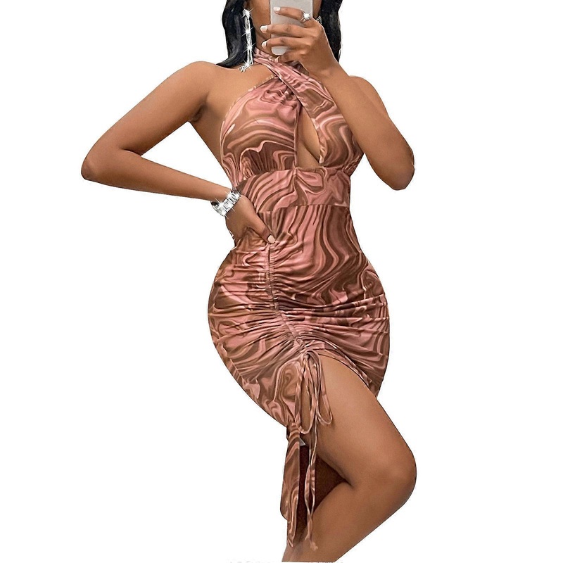 [“brand new and high quality\nFeatures:\nMade of high quality polyester, skin-friendly, stretchy, soft and comfortable, breathable.\nSleeveless, criss for cross halter neck, sexy off shoulder and backless, hollow out keyhole front.\nGradient striped print, side split with drawstring ruched, high waist, bodycon fit, sexy package hip.\nYou can match some trinkets, jackets, leather coats, coats, cardigans, high heels, boots, and sandals.\nMidi long dress, knee length, show your best cruve. Trendy and unique design make you more attractive.\nSuitable for club, nightclub, party, night out, cocktail, casual, beach, evening, special occasion, and so on.\n1 dress only, other accessories demo in the picture are not included!\n\nSpecification:\nMaterial: Polyester\nOptional Color: Coffee, Royal Blue, Rose Red\nSize: S/for M/L/XL(Chinese Size,follow the size chart to select please)\nSize:S\tLength:117cm(46.06inch)\tWaist:67cm(26.37inch)\tBust:90cm(35.43inch)\nSize:M\tLength:119cm(46.85inch)\tWaist:71cm(27.95inch)\tBust:94cm(37.01inch)\nSize:L\tLength:121cm(47.63inch)\tWaist:77cm(30.31inch)\tBust:100cm(39.37inch)\nSize:XL\tLength:123cm(48.42inch)\tWaist:83cm(32.67inch)\tBust:106cm(41.73inch)\nQuantity: 1 pc \n\nWarm prompt:\n1.Asian people size is 1 or 2 sizes smaller than European and American.\n2.Please note that low temperature washed,do not bleach and place under the blazing for sun for quite a long for time.\n3.As different measuring methods,it will occur 1-3 for cm deviation about the items,please ensure that it is okay for you before ordering.\n4.Because of different monitors and lamplight,the picture may not reflect the actual color of the item,really thank you for your kind understanding!\n \nPackage includes:\u007F\n1 x Dress(without retail package)”]