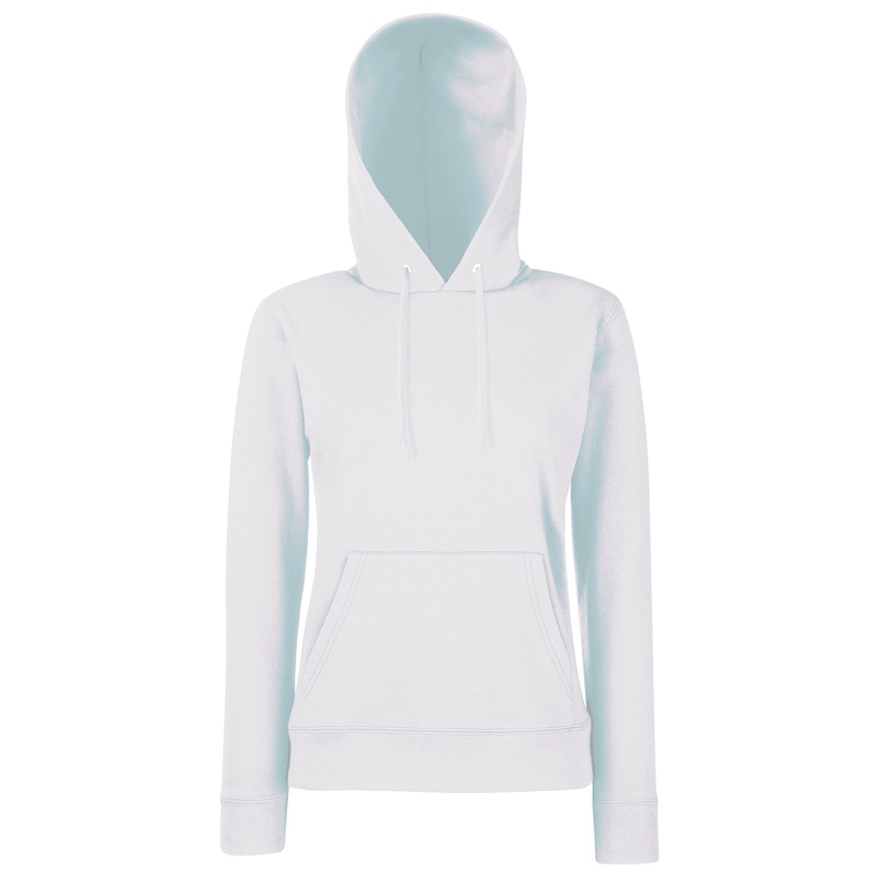 Made with a double fabric hood and shaped side seams for a feminine fit, the women's classic hooded sweat is perfect for promotions, music merchandise, licensing, tourism and more. Details include a front kangaroo pocket and self-coloured flat drawcord and